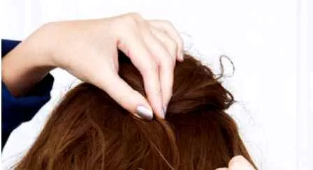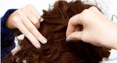Step2:将头顶的头发扭转后轻轻往前推,然后用发夹固定好。