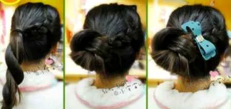 Step4:下面就开始花苞头发型,先把蝴蝶结取下来,把马尾辫往一个方向扭转。