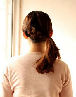 4、再将辫子与侧面的头发扎成一个马尾。