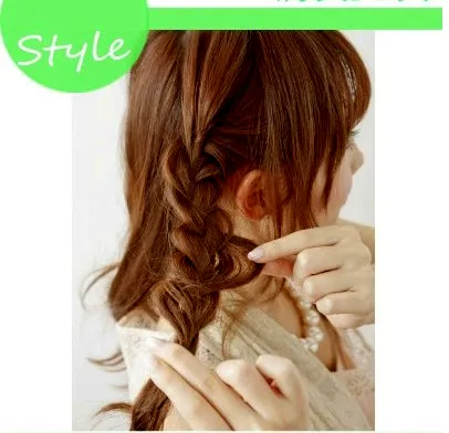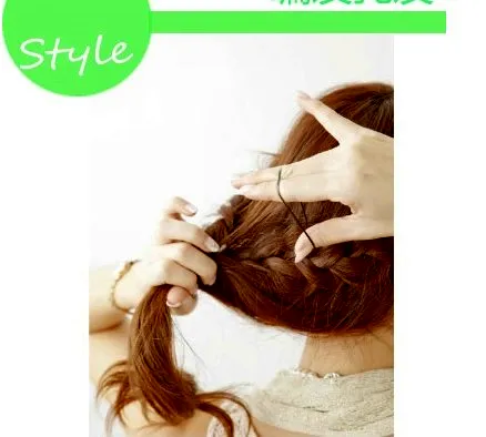 Step2:接着取出一小束头发出来,进行三股的麻花辫编发的处理,但为了麻花辫显得更加蓬松一些,用皮筋在固定的同时要显松散一些。