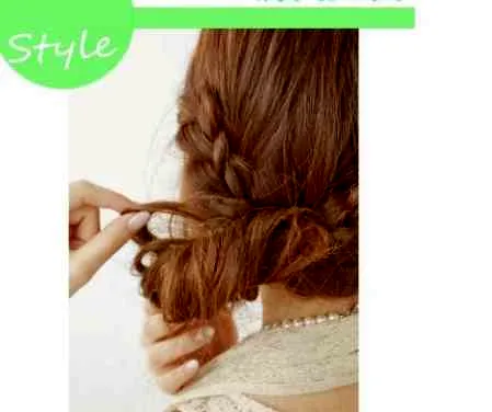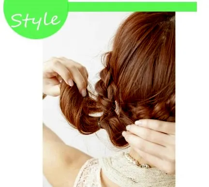 Step4:接着再将两个辫子向中间的空隙出穿**去,再穿插好的马尾进行扭转的处理。
