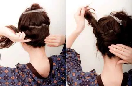 步骤4:将扭转的头发倾斜45度角向上拉扯,注意抚平脑后的造型,当头发扭转到最大限度时会自然缠绕。