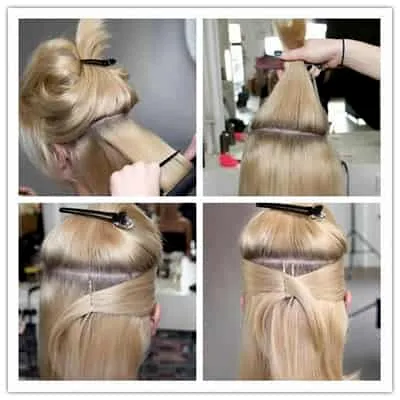 5、将上班部分的头发放下,与下面的头发一起做内卷。