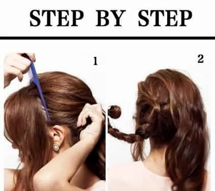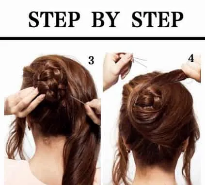 STEP 4:右边的头发不用扎辫子,将它们直接绕在发髻上即可,同样小夹子将发尾固定。