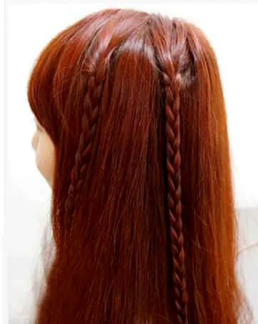 Step1:沿着刘海从前额取出一小束头发,再编织成一条三股辫,发尾处用橡皮筋固定好。
