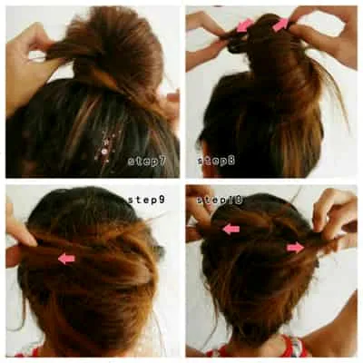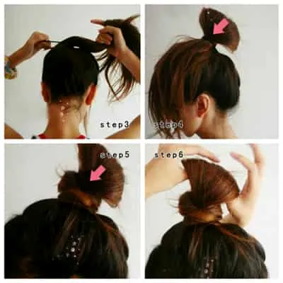 Step5:把剩余发尾的发丝顺时针绕在马尾根部固定好。