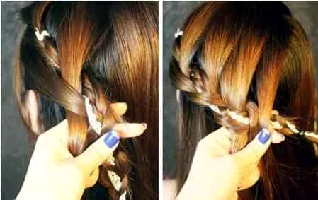 Step11:然后从左边取出一股头发,放入麻花辫中,右边不用取,到刚刚左边编好的麻花辫处,也将作为一股编入其中。