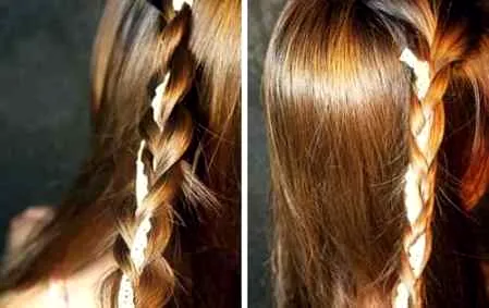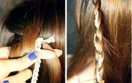 Step2:把蕾丝带和其中一股头发融合在一起,编成普通的麻花辫,一直编到发尾后,用皮筋固定住。
