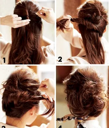 Step2:刘海中分,扭转松散的头发固定到顶部。