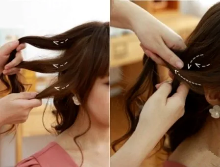 第二步:脸颊留出一束发丝,将右侧的头发分成三束,编织成三股辫。