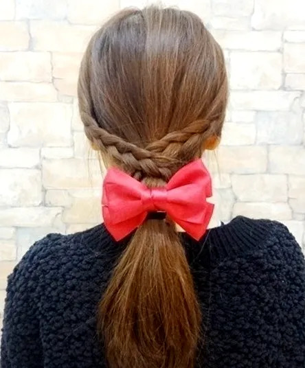 步骤三:将两侧编好的辫子缠绕在低马尾上用黑色小发夹固定住即可。