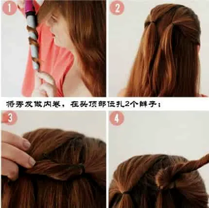 STEP 1:先打造出卷发的模样,用卷发棒将所有头发做内卷,在头顶处扎好两个辫子。