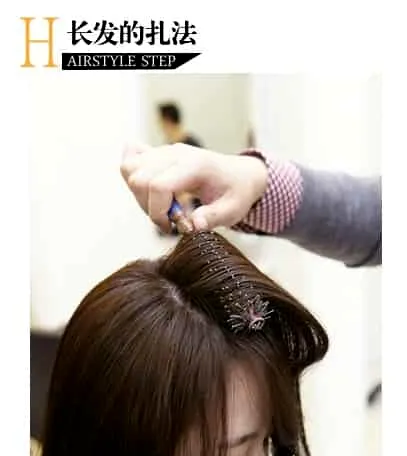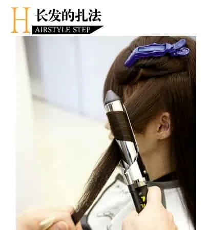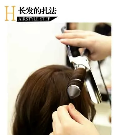 Step1:先是头顶上方头发的塑造出一种蓬松感出来,利用卷发棒将发丝进行卷翘的处理。最好是一小束一小束的进行。在靠近脸颊部分的刘海上也不能错过,因为这样才能更符合整个发型的塑造。