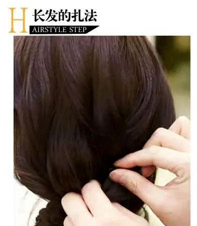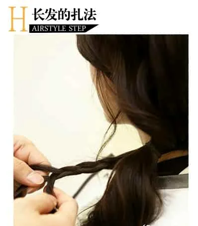 Step2:接着将头发一把抓取,扎成一个侧扎的马尾的样子出来,接着取出一小束头发进行麻花辫的编织,之后再将编织好的辫子围绕着发圈捆绑的地方进行缠绕起来,用发夹固定之后,稍微再打理下马尾,那么整个发型卷发扎发就完成了。