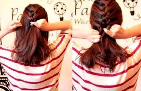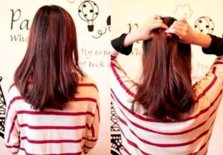 步骤三:到了耳垂一下就以正常的三股辫开始编,再用黑色橡皮筋固定住,再弯斤头发内。