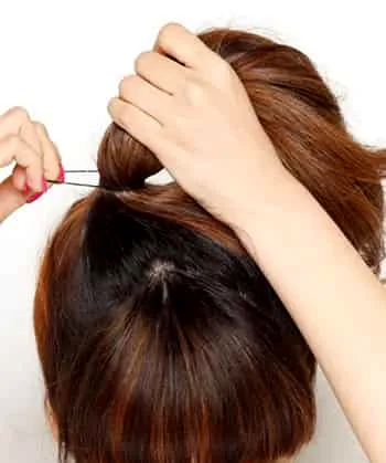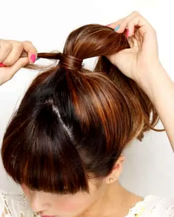 Step2:取马尾中的一小搓头发,绕着马尾固定起来,遮住皮筋会更先清爽。如果觉得太紧,可以稍微拨松两侧的头发。
