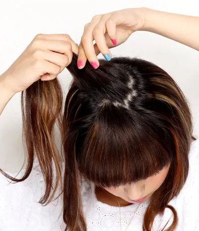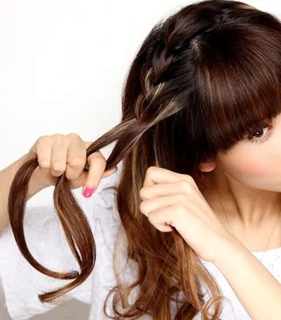 Step2:接着从头顶开始沿着刘海的部分,抓取一束头发出来,进行编发,一直编织到接近到发尾的部分。