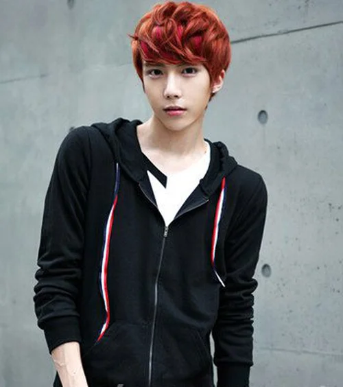个性的染发颜色,搭配厚重的斜刘海,再加上时尚的男生烫发设计,打造一款十足的潮男风范,显得十分帅气有型。