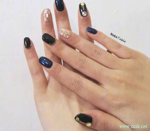 挺有时尚感的一款黑色美甲,与宝蓝色美甲跳色+钻搭配,是不是够时尚大气?