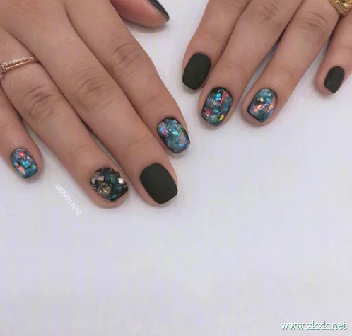 纯黑色美甲与这种星空美甲搭配还蛮有个性的,看起来简约却透出低调般的时尚感,手上效果超赞。