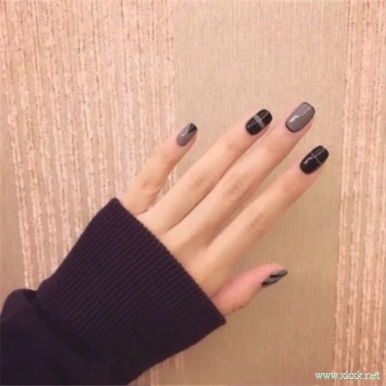 都是黑白配,在美甲中这种黑色配白色美甲也很常见,加入线条设计,整款美甲还是相当不错的。