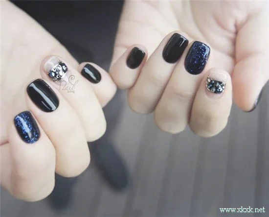 在黑色中添加蓝色亮片很低调,有很有格调,是非常精致的一款美甲。