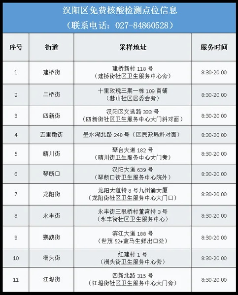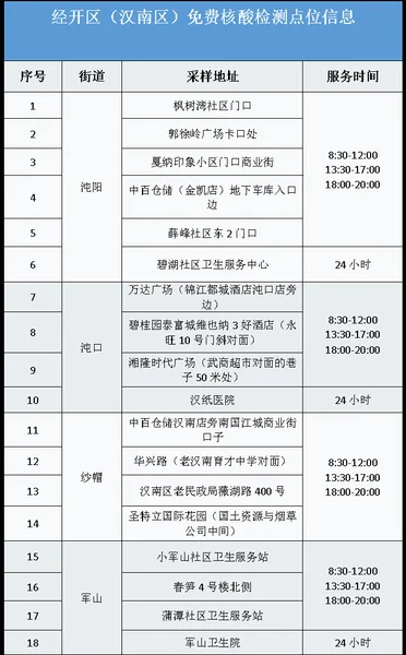 从武汉市获悉,该区为进一步加强常态化疫情防控,方便广大市民核酸检测,即日起为广大市民提供免费核酸检测服务,该区便民核酸采样点位及开放时间如下: