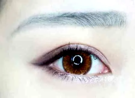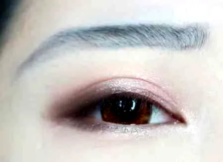 深棕色眼影用刷子沾取,在眼尾晕染开来,带过下眼睑眼尾三分之一处,这样眼睛看起来更大更有神。