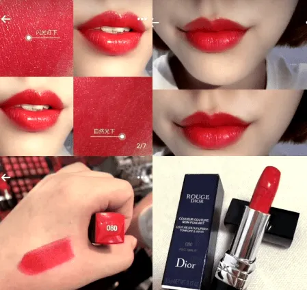 080 Red Smile 微笑正红 ‘’最是那回眸一笑 万般风情绕眉梢‘’ 董卿款。在这个颜色特别的明亮。也是本人非常喜欢的一款、颜色很有通透感。比起经典999#要透亮一点、缎光感非常强烈哦。