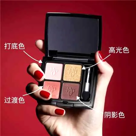 高光色最浅,一般带珠光,阴影色最深,打底色一般是米色、肤色过渡色比阴影色浅,是眼影的主色调。
