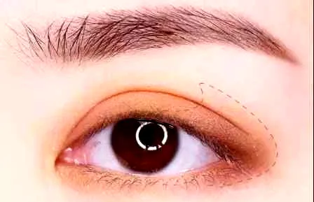 STEP4:在图中的虚线内涂抹少量的米金色珠光眼影提亮。但是要注意这种画法不适合单眼皮、内双、肿泡眼,会显眼睛肿。