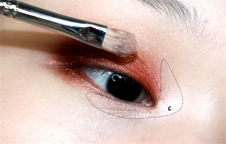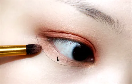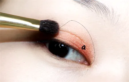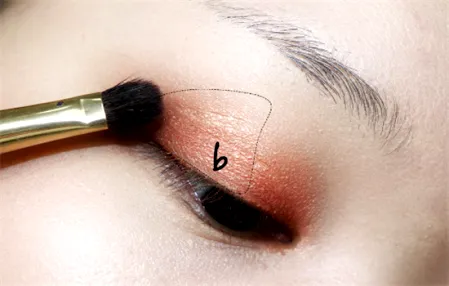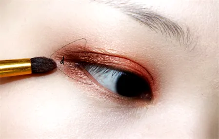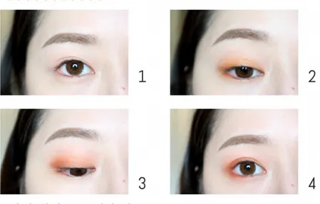 2.橘色铺在双眼皮褶皱内和下眼尾后半段。