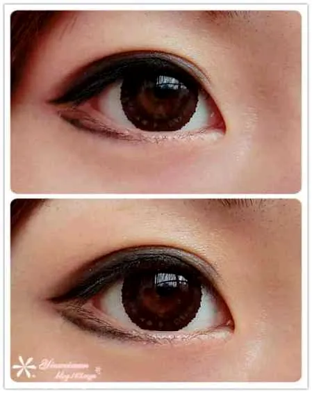 先在眼窝处用灰色眼影打底,提亮眼部轮廓。再用黑色眼影沿着睫毛与双眼皮之前刷出眼线的效果。