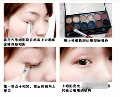 在眼窝处涂上米色眼影打底,再用深咖啡色在双眼皮处描画。