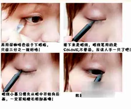 为了让眼妆更完整,在下眼睑尾部同样刷上深咖啡色眼影。勾画眼线时,可以先沿着睫毛根部画出内眼线,再在尾部加粗。