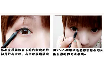 画好眼线后,再**下眼线与睫毛根部是否有空隙,有就进行填充。选择银白色眼线在眼角处提亮。