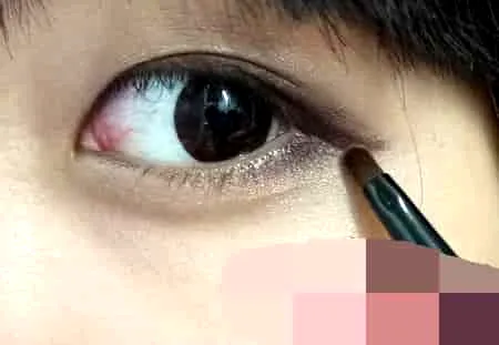 步骤四:再蘸取梅红色眼影,涂抹下睫毛根部的后面1/3。