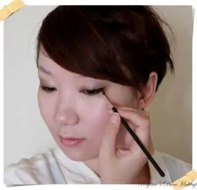 使用小号的眼线刷蘸取眼线膏,在纸上拍点多余的膏状就可上眼线了。从眼头开始向眼尾延伸,加重眼线中间部分。