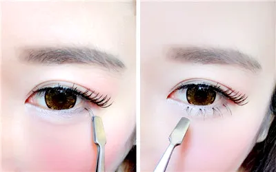 第五步:选择自然纤长的假睫毛佩戴上去,下睫毛需要一簇一簇的黏贴。