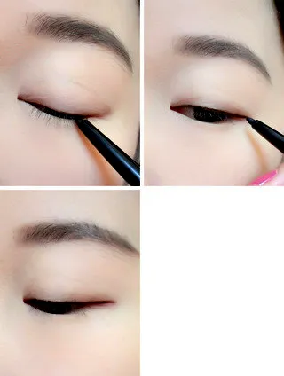 第二步:选择黑色的眼线笔,紧贴睫毛画上一条细细的眼线,眼尾需拉长一些。