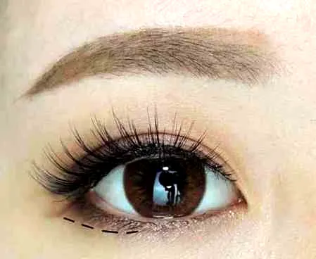 先来解析画下睫毛的位置:从你下睫毛开始秃的地方开始画,渐渐加长至眼尾,范围如图。