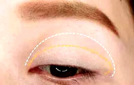 用手机沾取哑光浅米色眼影大面积涂在眼皮上,珠光色小范围画在双眼皮褶皱内。