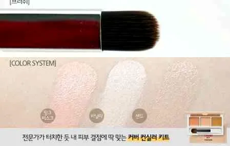 这款是集合了三个颜色遮瑕盒,搭配一把扁平状的遮瑕专用刷,颜色分为偏粉、亮白、肤色三种。
