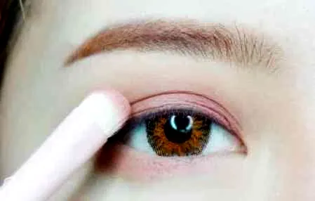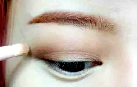 第二步:锥形眼影刷从眼尾三角往前画,加深双眼皮褶皱。