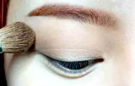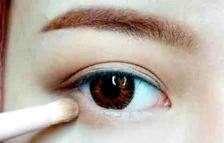 第一步:大号眼影刷取第二深棕平铺整个上眼皮,打造轮廓感。