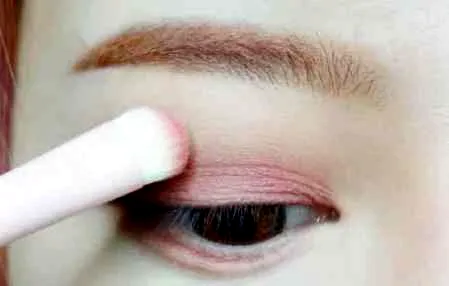 第四步:小号眼影刷红色平铺在双眼皮褶皱范围内,可以稍微往上晕染。