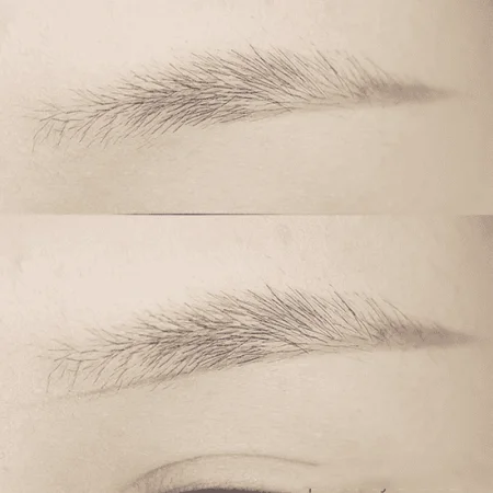 用笔尖最尖的部分,从下往上画眉头的毛流。眉尾秃的地方同样补几根显色的毛流。最后用染眉膏刷一下,同化眉毛颜色。