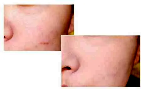 可以看出来原来模特脸上有两处痘印,鼻翼旁的肌肤毛孔有些大,上了一层粉底液后,,毛孔很好的抚平了,痘印也遮了90%左右,妆感很清透,肤色基本没什么改变,非常自然。