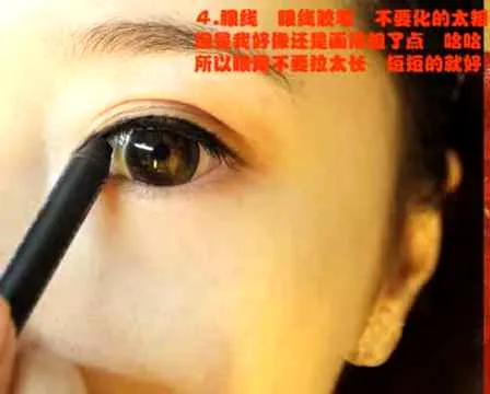 第五步:画眼线。想要营造出裸妆的效果,眼线可以不用画的太粗。眼尾处不要拉得太长,感觉会更显自然。