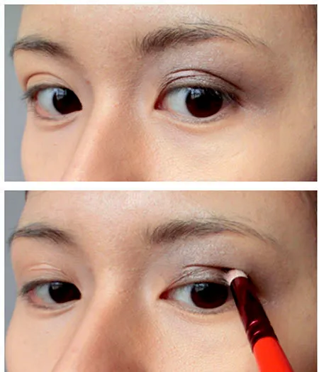第三步:先用浅咖啡色的眼影打底,然后在用咖啡色的眼影加重眼尾部分。